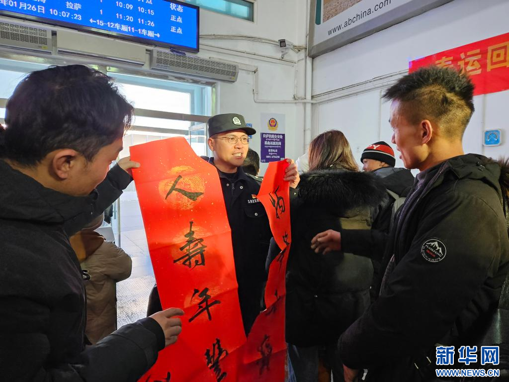1月26日,在藏北高原零下20多攝氏度的那曲站,該站派出所民警按照上級安排部署,精心組織謀劃,凝聚全警力量,以“細致、精致、極致”的工作作風為萬千群眾平安出行保駕護航,通過開展志愿服務、法制知識宣傳、“寫春聯(lián)、送祝?!钡然顒樱e極營造“春運回家路、鐵警伴你行”的濃厚氛圍,讓廣大群眾在奔赴“回家”的路上更加暖心、安心、放心,不斷提升群眾安全感、幸福感和滿意度。