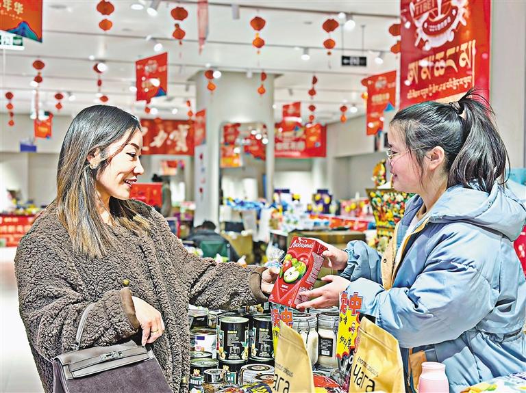 除了傳統(tǒng)年貨市場(chǎng)的八廓商城,拉薩市各大商場(chǎng)、超市也提前備好了年貨。為期9天的“洋”年貨展銷(xiāo),更是讓共建“一帶一路”倡議呈現(xiàn)在民間交往交流交融中。