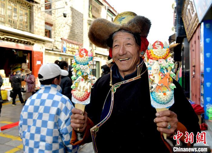 圖為手工藝人杰布展示制作完成的酥油花。李林 攝