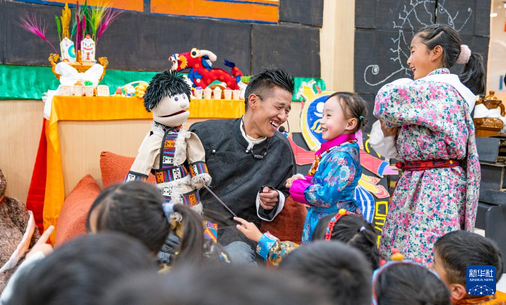 2月3日,手偶表演演員在拉薩的兒童藏裝派對上和孩子們互動。新華社記者 丁增尼達 攝