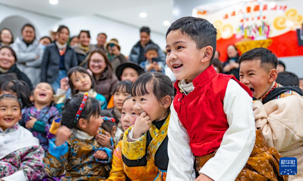 2月3日,孩子們在拉薩的兒童藏裝派對上觀看手偶表演。新華社記者 丁增尼達 攝