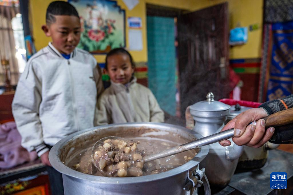 在位于西藏拉薩市當(dāng)雄縣公塘鄉(xiāng)甲根村的家中,斯曲旺姆的重孫子和重孫女在等待“古突”上桌(2月8日攝)。新華社記者 孫非 攝