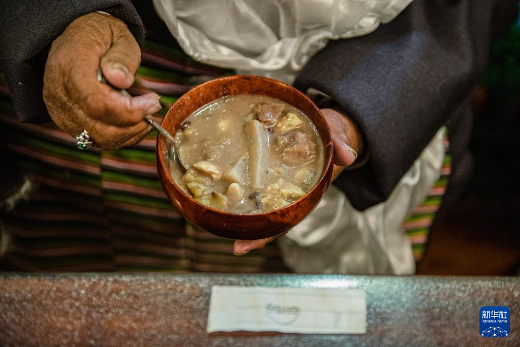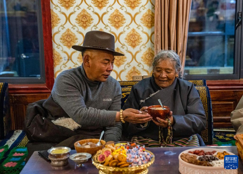 在位于西藏拉薩市當(dāng)雄縣公塘鄉(xiāng)甲根村的家中,斯曲旺姆的兒子索朗羅達(dá)為母親端上“古突”(2月8日攝)。新華社記者 孫非 攝