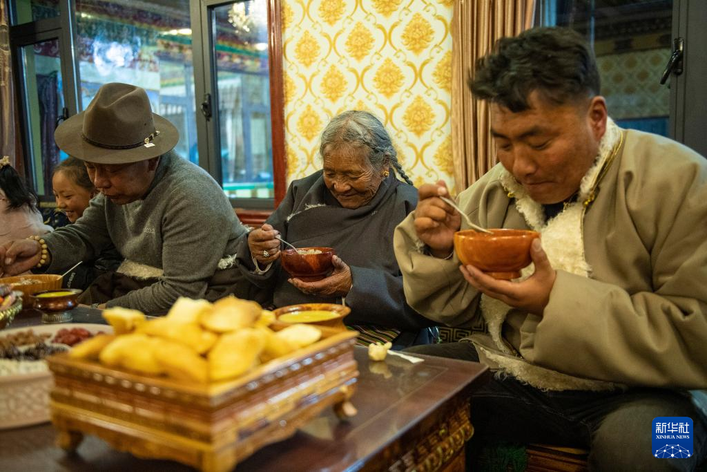 在西藏拉薩市當(dāng)雄縣公塘鄉(xiāng)甲根村,整個(gè)村子沉浸在節(jié)日氣氛中。村里的斯曲旺姆老人家四世同堂,房屋寬敞明亮。手里捧著盛滿“古突”的木碗,斯曲旺姆老人希望這樣的幸福能長(zhǎng)長(zhǎng)久久。