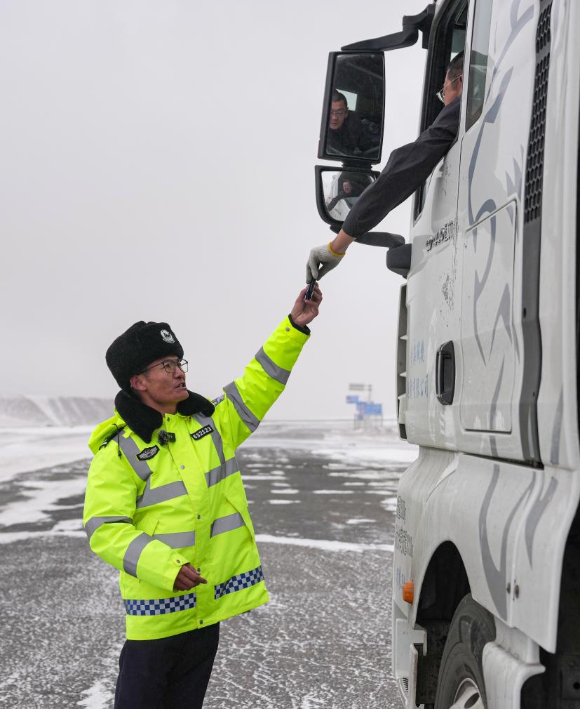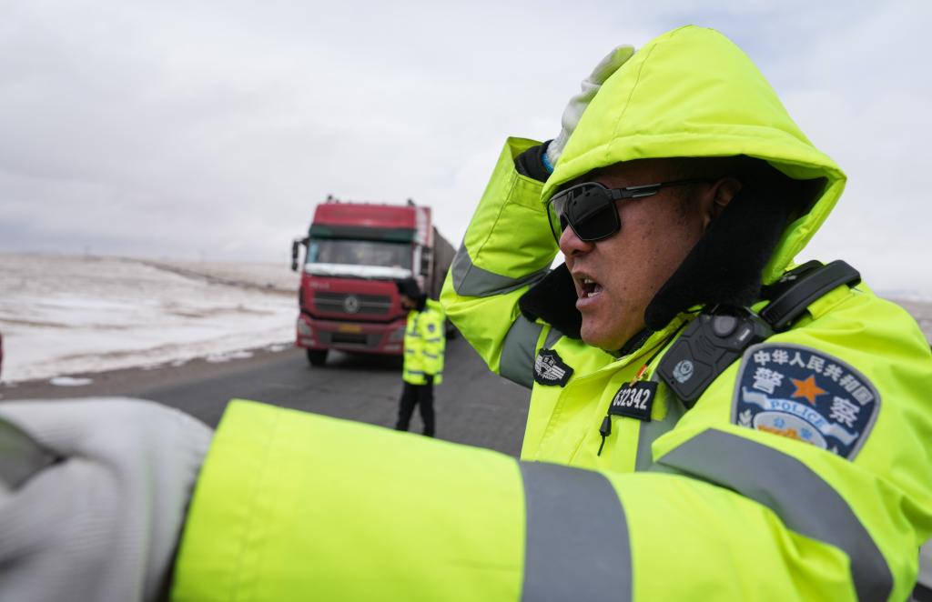 安多交警大隊秩序中隊隊長達(dá)娃云旦提醒駕駛員雪天小心駕駛。新華社記者 晉美多吉 攝