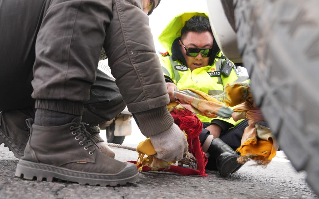 安多交警大隊交警幫助故障車輛安裝拖拽繩。新華社記者 晉美多吉 攝