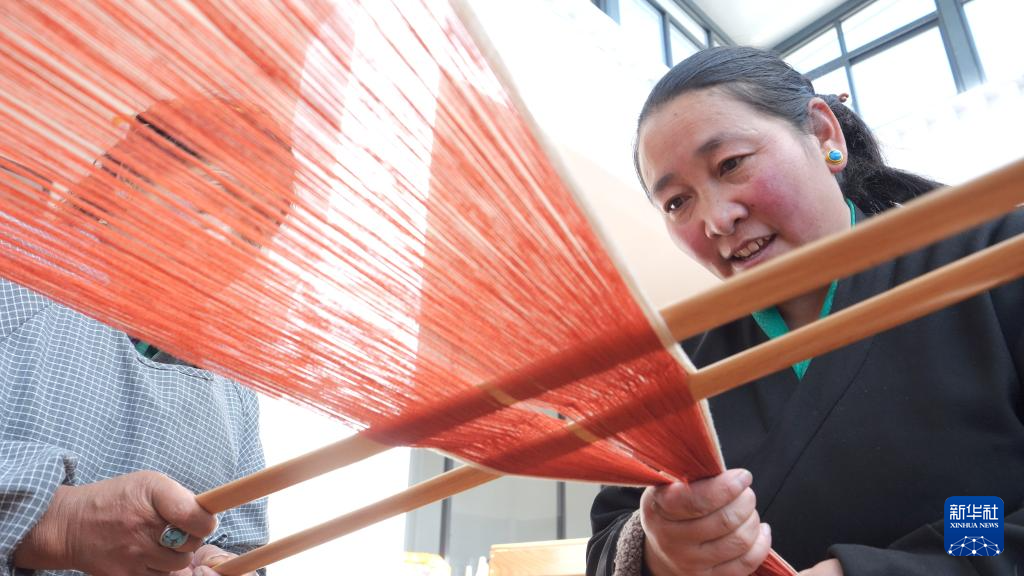 春節(jié)期間,現(xiàn)年40歲的格桑卓瑪和合作社成員抽空就聚在一起編織氆氌,歡聲笑語不斷。