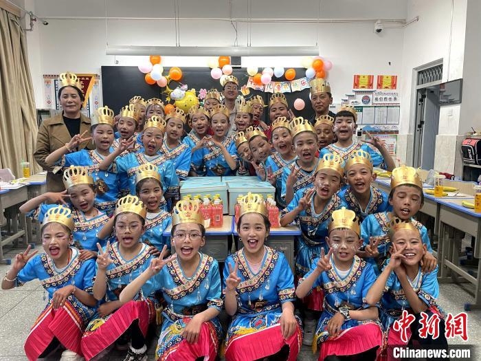 圖為襄陽(yáng)市“格?;ā敝Ы虉F(tuán)老師陪瓊結(jié)鎮(zhèn)小學(xué)孩子們過(guò)集體生日。曲杰 供圖