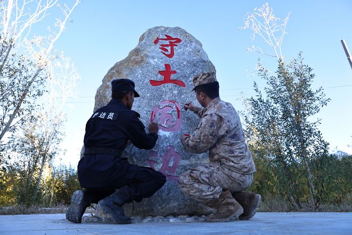 阿里軍分區(qū)某邊防團(tuán)扎西崗邊防連戰(zhàn)士和移民管理警察共繪固邊石碑(2023年9月27日攝)。新華社發(fā)(李思鑫 攝)