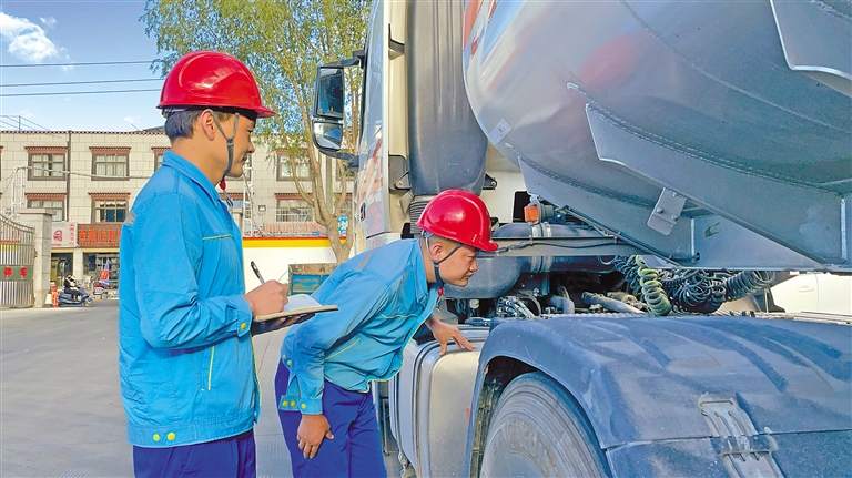 中國(guó)石油運(yùn)輸西藏分公司工作人員在對(duì)油罐車(chē)輛進(jìn)行安全檢查。記者 次仁平措 通訊員 格桑旦增 攝