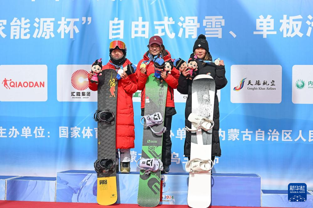 2月19日,在第十四屆全國冬季運動會單板滑雪青年組女子障礙追逐比賽中,西藏隊選手擁青拉姆、湖北隊選手楊禮妍和遼寧隊選手馮賀分獲前三名。新華社記者 李志鵬 攝