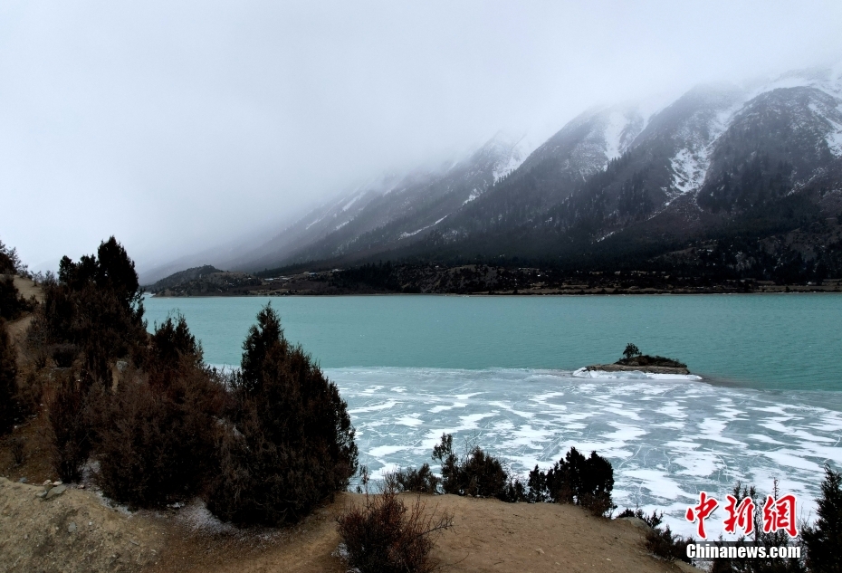 2月21日,西藏昌都市八宿縣,然烏湖半冰半水的湖面如畫一般,美不勝收。(無人機照片)中新社記者 李林 攝