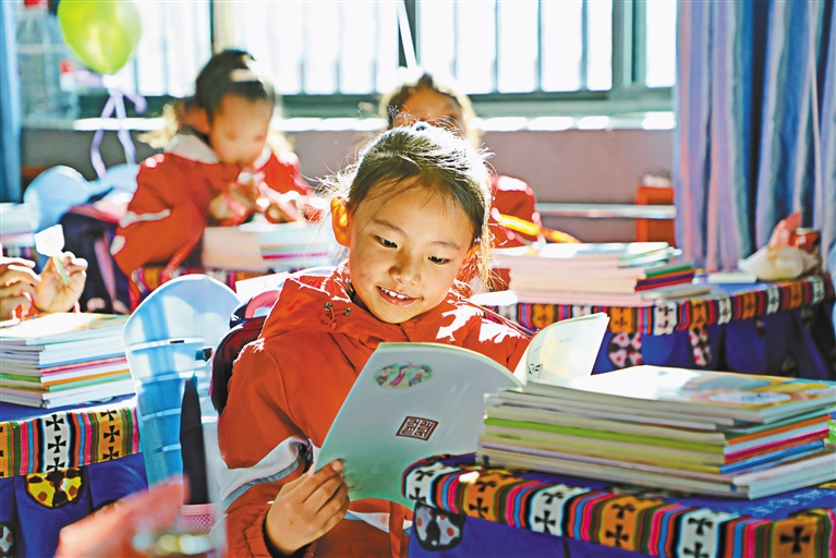 阿里地區(qū)陜西實(shí)驗(yàn)學(xué)校開(kāi)學(xué)第一天,孩子們開(kāi)心閱讀新課本。記者 洛桑旦增 達(dá)珍 永青 攝