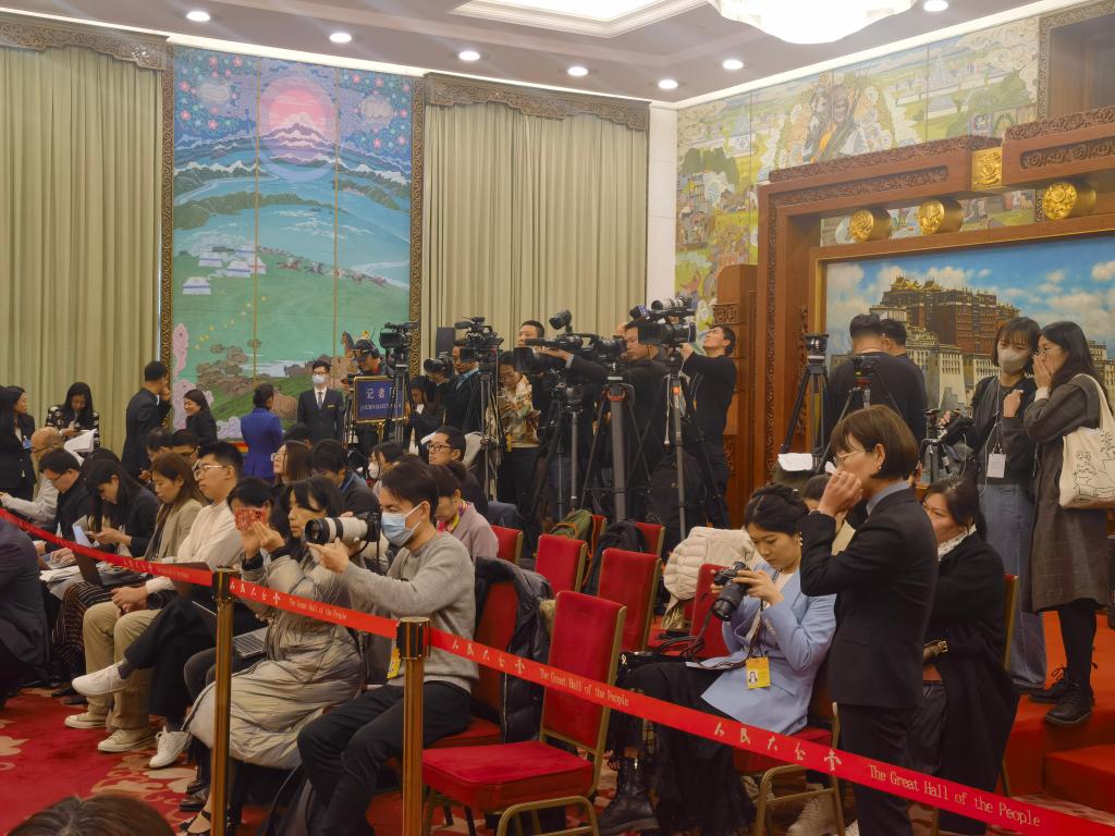 3月6日下午,中外記者在人民大會堂西藏廳參加十四屆全國人大二次會議西藏代表團(tuán)開放團(tuán)組活動。(新華社記者韓潔 攝)
