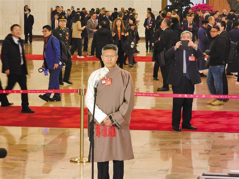 圖為3月7日上午,全國政協(xié)十四屆二次會(huì)議第二場(chǎng)“委員通道”集體采訪活動(dòng)開啟。圖為住藏全國政協(xié)委員達(dá)瓦頓珠亮相“委員通道”并回答記者提問。