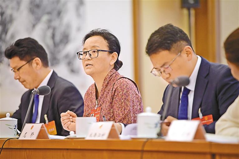 圖為3月7日,西藏代表團(tuán)舉行全體會(huì)議,傳達(dá)學(xué)習(xí)習(xí)近平總書記在看望參加全國政協(xié)十四屆二次會(huì)議的民革、科技界、環(huán)境資源界委員并參加聯(lián)組會(huì)議時(shí)的重要講話,審議國務(wù)院組織法修訂草案,繼續(xù)審查計(jì)劃報(bào)告和草案、預(yù)算報(bào)告和草案。圖為尼珍代表在會(huì)上進(jìn)行討論發(fā)言。 旦增西旦 攝