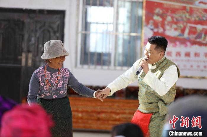 圖為演出中,西藏出入境邊防檢查總站文藝骨干與阿里地區(qū)扎西崗鄉(xiāng)群眾互動。 胡俊浩 攝