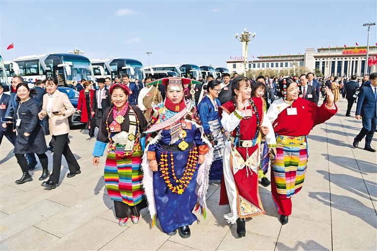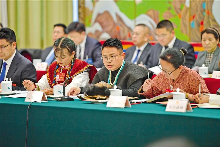 圖為西藏全國人大代表扎西江村(右)在西藏代表團(tuán)全體會議上發(fā)言。旦增西旦 攝