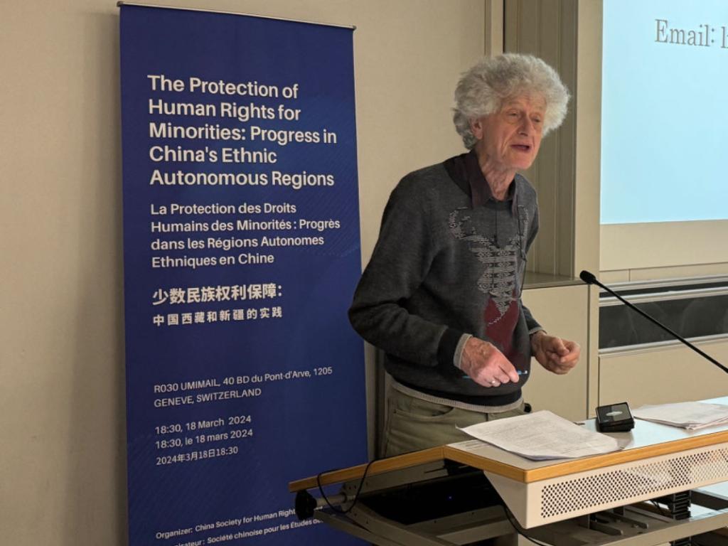 3月18日,由中國(guó)人權(quán)研究會(huì)主辦的“少數(shù)民族權(quán)利保障:中國(guó)西藏和新疆實(shí)踐”主題講座在瑞士日內(nèi)瓦舉行。圖為比利時(shí)知名藏學(xué)家安德烈·拉克魯瓦在講座上發(fā)言。新華社記者石松攝