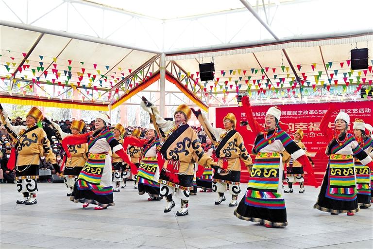 3月25日,由拉薩市城關(guān)區(qū)委、區(qū)政府主辦,城關(guān)區(qū)委宣傳部承辦的“我們的幸福生活”紀(jì)念西藏民主改革65周年文藝活動,在宗角祿康公園舉行?;顒釉陂_場歌舞《美麗的西藏·可愛的家鄉(xiāng)》中拉開序幕,現(xiàn)場觀眾熱情高漲,隨著歌舞旋律的起伏,不時(shí)報(bào)以熱烈的掌聲。此次文藝活動充分展現(xiàn)了高原各族兒女對中國共產(chǎn)黨、偉大祖國和新時(shí)代的感恩之情。城關(guān)區(qū)委宣傳部常務(wù)副部長王全勝表示:“通過搭建文藝演出平臺,各族群眾能夠一展才藝、分享幸福生活,讓大家零距離參與文化活動,既豐富了人民群眾的精神文化生活,又激發(fā)了大家共建幸福新西藏的熱情?!?/p>