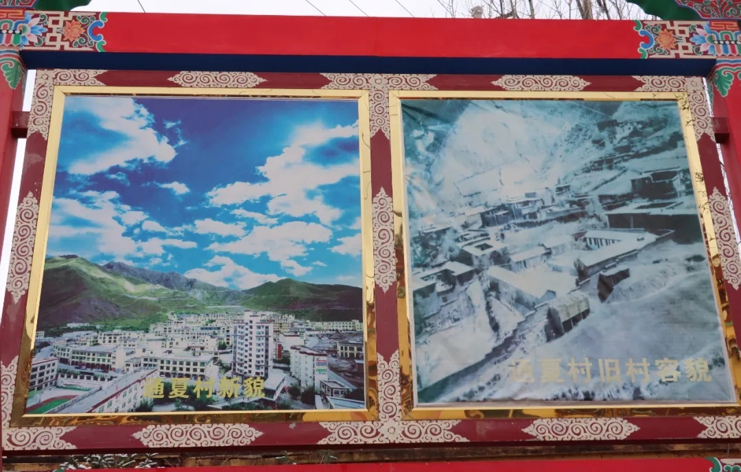 而在通夏村門口,兩幅照片十分顯眼,一幅是通夏村新貌,一幅是舊貌。在舊貌中,低矮的土平房在大雪積壓下,東零西落地散布在起起伏伏的坡面上,冰雪覆蓋的泥濘小道幾乎無法通行?!斑@樣的土坯房我和先輩們住了幾十年,更早以前,甚至都沒有房子,放牧到哪里,帳篷就支到哪里。”今年83歲的村民達瓦扎巴指著老照片說。而在一旁新貌圖中,蔚藍的天空下一幢幢藏式小樓整齊林立,寬敞的水泥路通家達戶,一派欣欣向榮的景象……