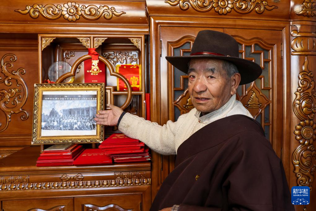 扎巴旺旦在展示自己獲得的榮譽(yù)和參加活動(dòng)的合影(3月11日攝)。新華社記者 姜帆 攝