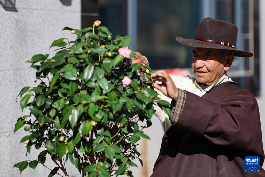 扎巴旺旦在家門(mén)口為自己種的花剪枝(3月11日攝)。新華社記者 姜帆 攝