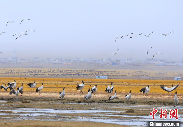 圖為拉薩市當(dāng)雄縣阿熱濕地里的黑頸鶴。索朗多杰 攝