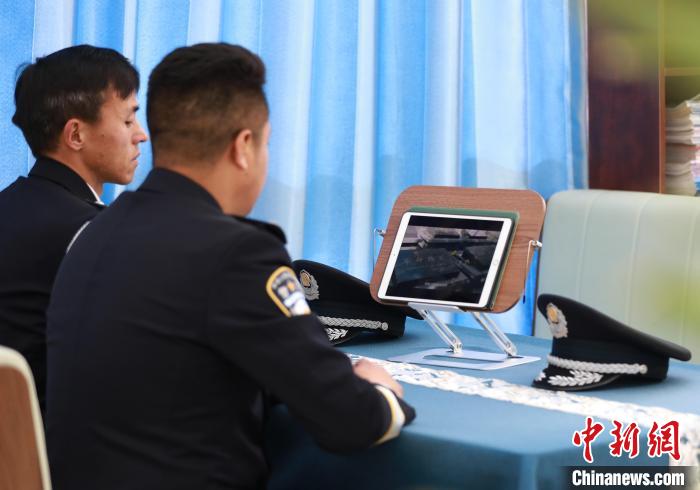 圖為移民管理警察旺青格列與海關(guān)緝私警察米瑪次仁觀看革命英烈宣傳片《犧牲在黎明》。肖富貴 攝
