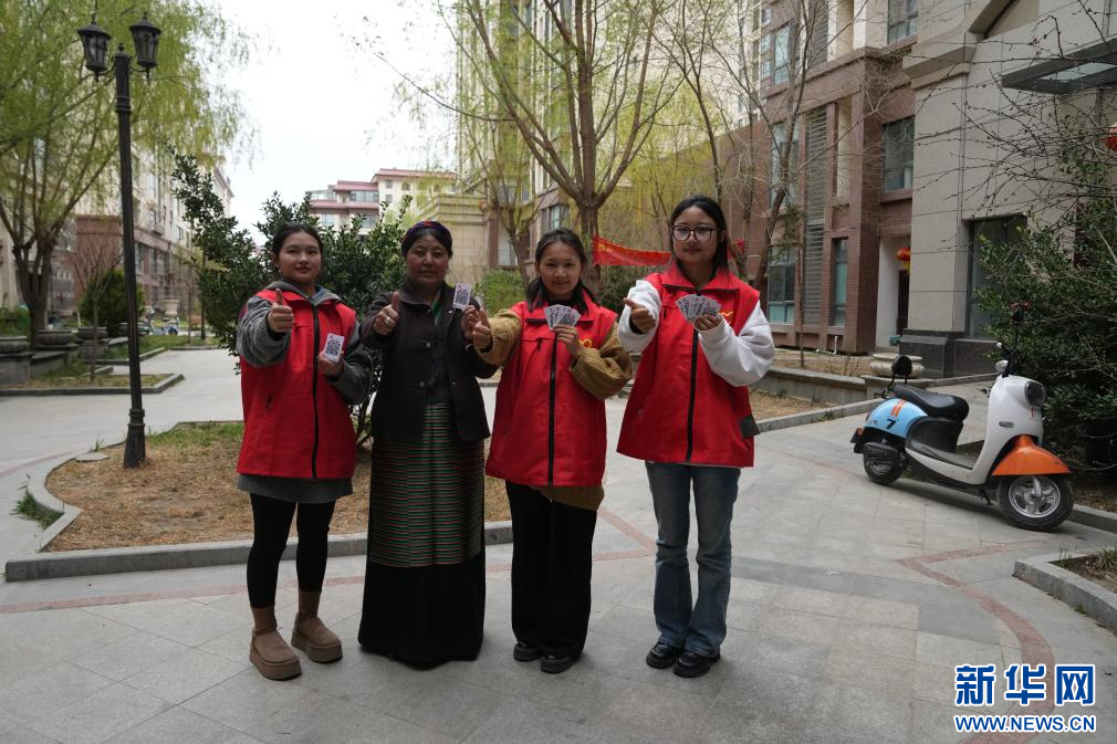 4月2日,納金村居民和工作人員為網(wǎng)格便民二維碼點(diǎn)贊。(新華社記者 晉美多吉 攝)