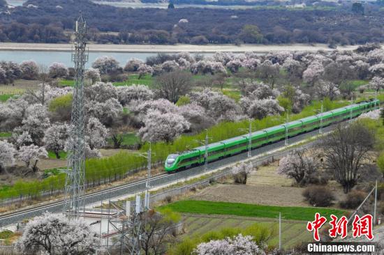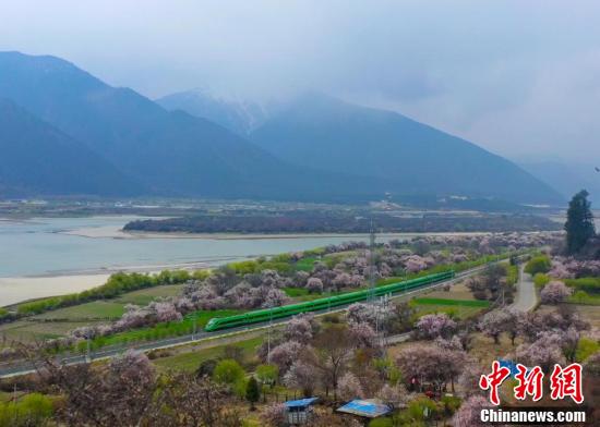 復興號動車組不僅是一種便捷的交通方式,更成為了一種獨特的旅游體驗,讓游客能夠近距離欣賞到西藏林芝春季獨特的自然美景。圖為穿梭在桃花林中的拉林鐵路高原復興號。