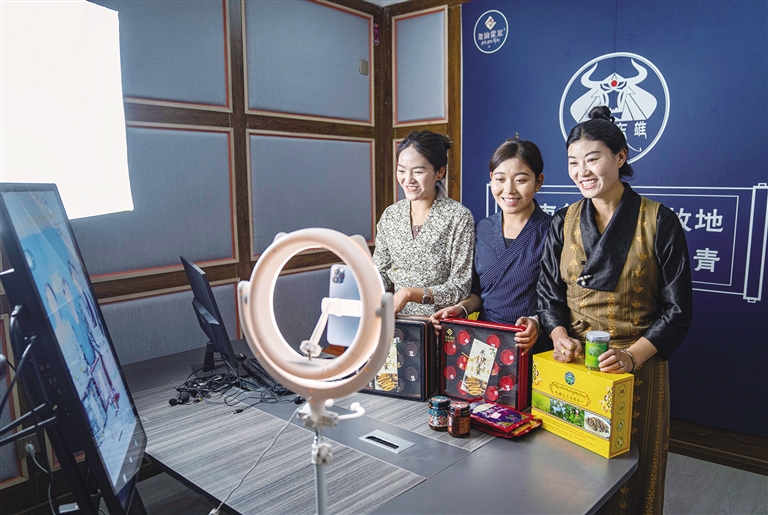 網(wǎng)絡(luò)主播在巴青縣“赤堆東雄”網(wǎng)紅直播間推介當?shù)靥厣r(nóng)牧產(chǎn)品。 新華社記者 孫非 攝