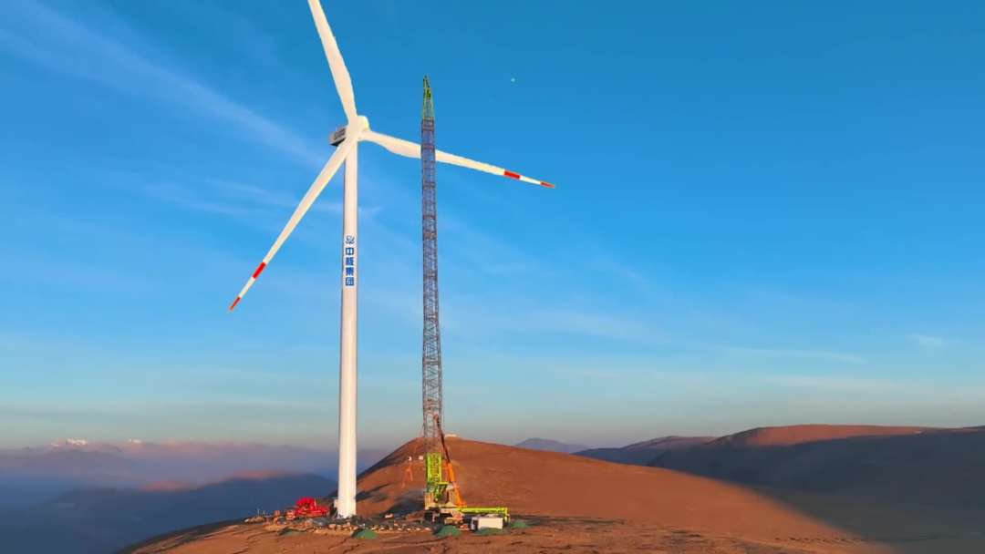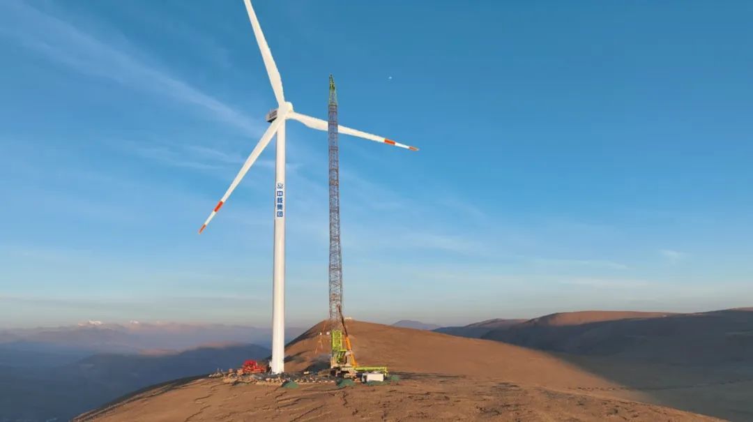 4月20日,在西藏自治區(qū)日喀則市薩迦縣的高原山地上,由中核匯能西藏公司投資、中核二二公司承建的中核集團(tuán)首個(gè)在藏風(fēng)電項(xiàng)目——中核薩迦30萬千瓦風(fēng)光儲(chǔ)一體化項(xiàng)目風(fēng)電場(chǎng)首臺(tái)風(fēng)機(jī)吊裝完成。根據(jù)測(cè)算,該風(fēng)電場(chǎng)區(qū)最高海拔達(dá)到5193米,是目前世界上在建海拔最高、單體容量最大的風(fēng)電項(xiàng)目。