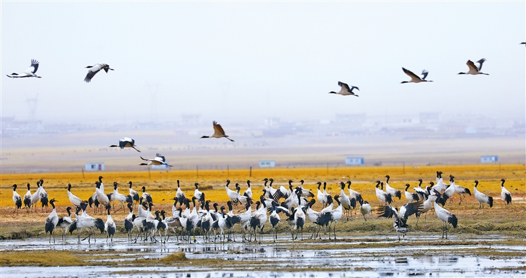 數(shù)量逐年增多的黑頸鶴成群遷徙停歇或繁殖,正是對(duì)當(dāng)雄縣生態(tài)環(huán)境持續(xù)向好的最美注腳。當(dāng)雄縣自然資源局(林業(yè)和草原局)局長(zhǎng)楊光富說(shuō):“近年來(lái),當(dāng)雄縣始終堅(jiān)持‘綠水青山就是金山銀山、冰天雪地也是金山銀山’的發(fā)展理念,率先在拉薩市成功創(chuàng)建全國(guó)生態(tài)文明示范縣和‘兩山’實(shí)踐創(chuàng)新基地。這兩塊金字招牌充分體現(xiàn)了當(dāng)雄的生態(tài)底色。下一步,我們將在全縣草原生態(tài)保護(hù)中重點(diǎn)突出阿熱濕地保護(hù),探索濕地黑頸鶴、斑頭雁等珍稀野生動(dòng)物活動(dòng)的特點(diǎn)規(guī)律,促進(jìn)濕地保護(hù)管理與濕地資源合理利用有機(jī)融合,確保探索形成守綠換金、添綠增金、點(diǎn)綠成金的‘兩山’轉(zhuǎn)化模式。”