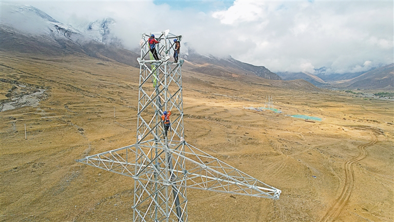 圖為工作人員在拉薩市林周縣色康村開(kāi)展拉薩500千伏輸變電工程組塔作業(yè)。記者 格桑倫珠 攝