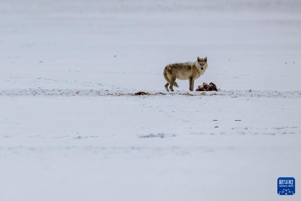在西藏那曲市尼瑪縣境內(nèi)的羌塘國家級自然保護區(qū)核心區(qū),一只狼在進食(5月9日攝)。新華社記者 姜帆 攝