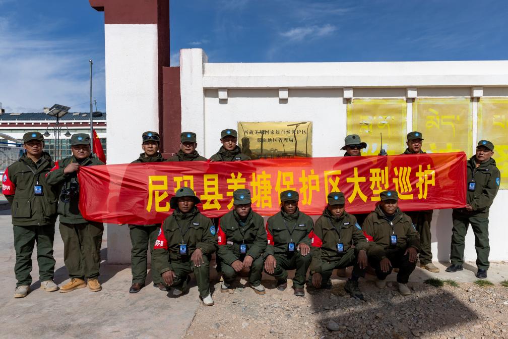 野生動物專業(yè)管護(hù)隊員出發(fā)巡護(hù)前在尼瑪縣縣城的羅布玉杰管護(hù)站合影(5月7日攝)。新華社記者 姜帆 攝