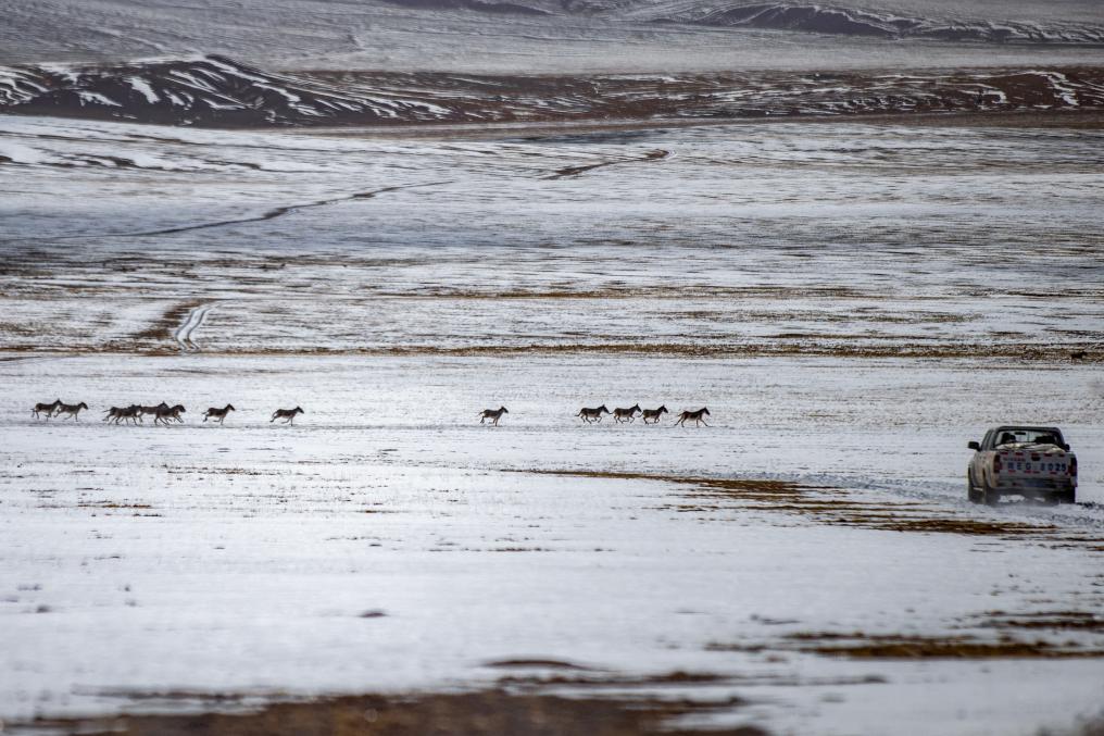 成群的藏野驢從野生動物專業(yè)管護(hù)隊員們的車前跑過(5月9日攝)。新華社記者 姜帆 攝