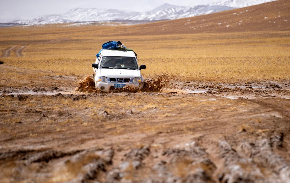 離開尼瑪縣城,巡山隊伍沿土路行進(jìn)。很快,土路沒有了,車隊只能沿著之前巡山時留下的車轍走。找不到車轍的時候,山就是路標(biāo)。