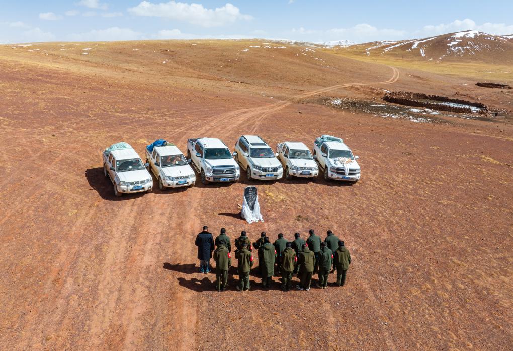 野生動物專業(yè)管護(hù)隊員在羅布玉杰烈士紀(jì)念碑前默哀致敬(無人機照片,5月10日攝)。新華社記者 姜帆 攝