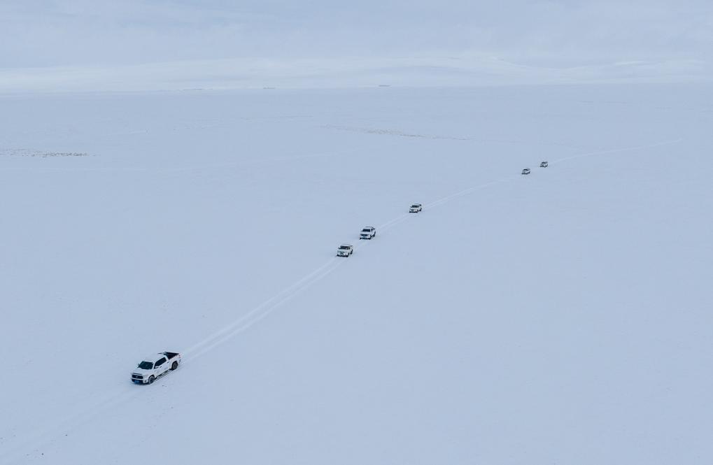野生動物專業(yè)管護(hù)隊員的車隊在大雪中巡護(hù)(無人機照片,5月8日攝)。新華社記者 丁增尼達(dá) 攝