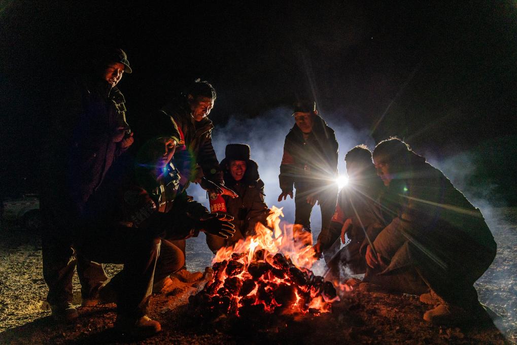 野生動物專業(yè)管護(hù)隊員在宿營地的寒夜里烤火,燃料是野牦牛的糞便(5月10日攝)。新華社記者 丁增尼達(dá) 攝