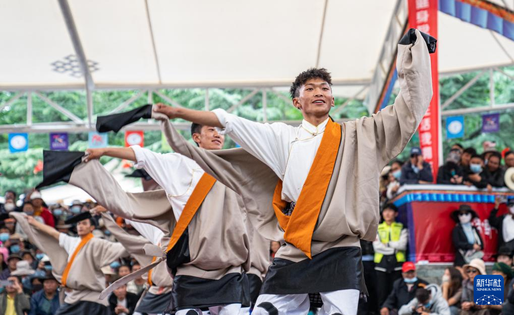 6月14日,參賽者在第二屆拉薩鍋莊舞大賽現(xiàn)場表演。新華社記者 丁增尼達(dá) 攝