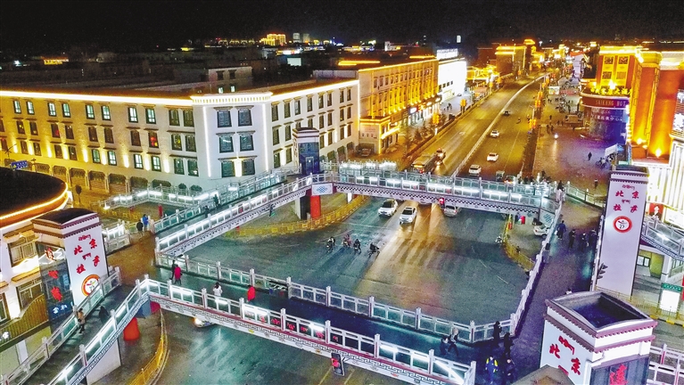 北京市第九批援藏工作隊投入1743.4萬元建設(shè)的、拉薩首座配置電梯的城市人行天橋—“連心橋”。
