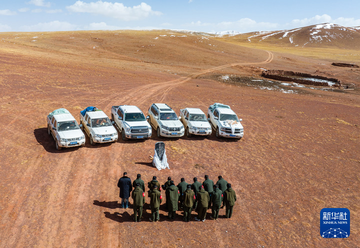 野生動(dòng)物專(zhuān)業(yè)管護(hù)隊(duì)員們?cè)跓o(wú)人區(qū)深處的羅布玉杰烈士紀(jì)念碑前默哀致敬(無(wú)人機(jī)照片,5月10日攝)。 新華社記者 姜帆 攝