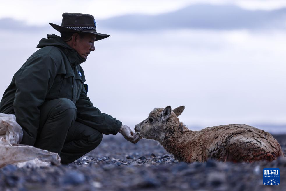羌塘國(guó)家級(jí)自然保護(hù)區(qū)的野生動(dòng)物專(zhuān)業(yè)管護(hù)隊(duì)員在安撫受傷的藏羚羊(6月13日攝)。新華社發(fā) 旦增 攝