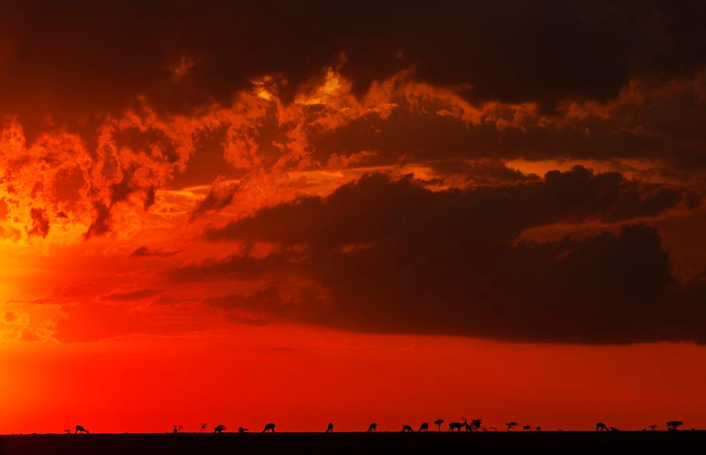 ↑ 在馬賽馬拉國(guó)家保護(hù)區(qū),遷徙中的野生動(dòng)物在夕陽(yáng)下覓食。