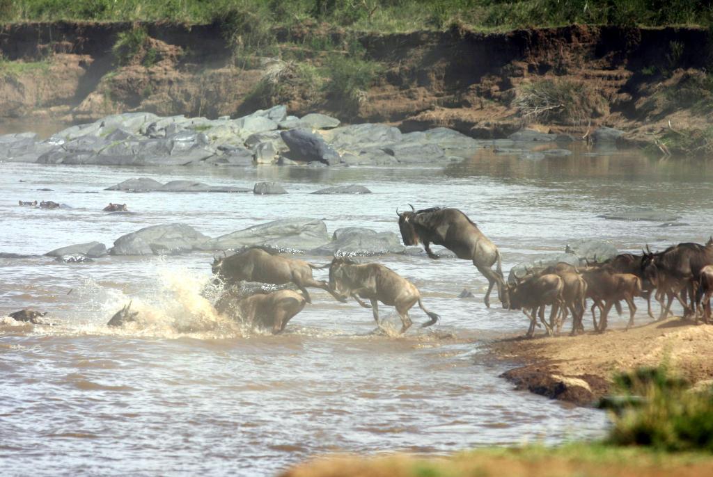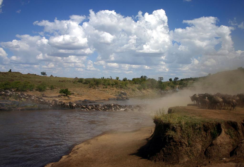 ↑ 在馬賽馬拉國(guó)家保護(hù)區(qū),遷徙中的角馬越過(guò)馬拉河。