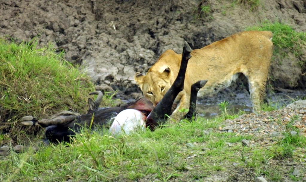 ↑ 在馬賽馬拉國(guó)家保護(hù)區(qū),一頭獅子正在享用自己的獵物。