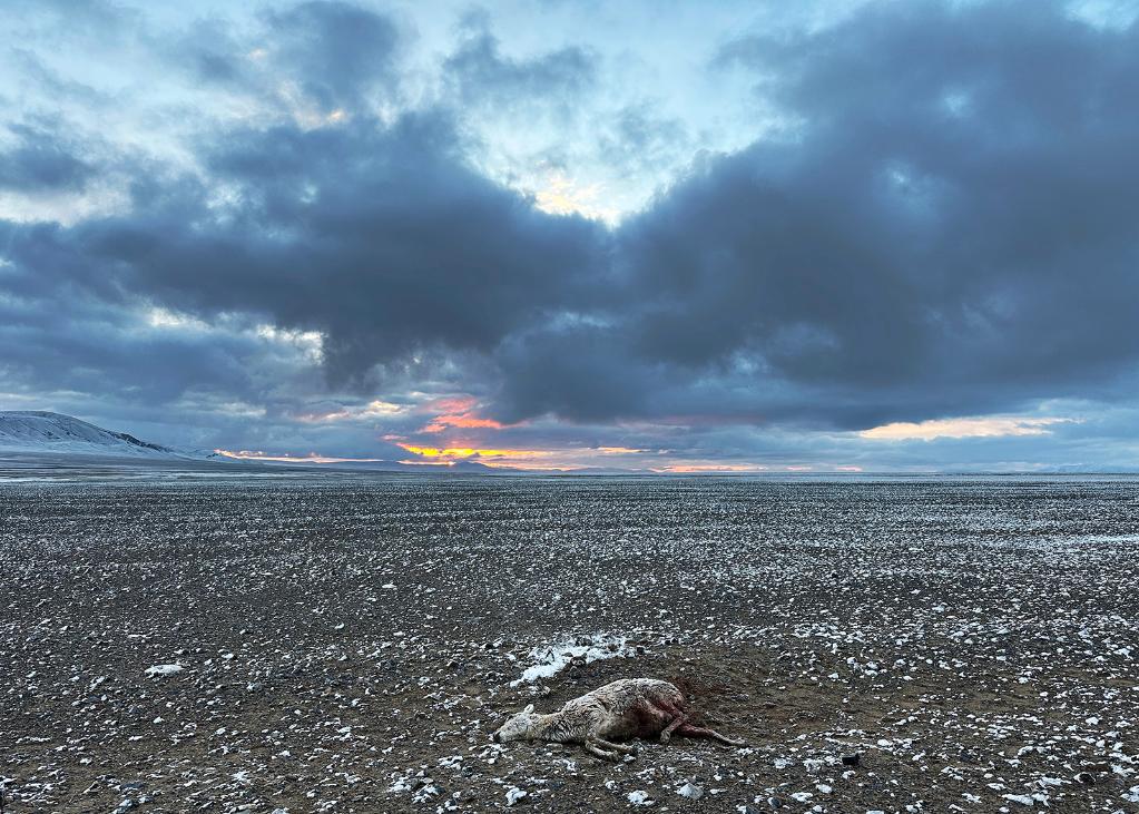 ↑ 在羌塘國(guó)家級(jí)自然保護(hù)區(qū),一只被野狼咬死的母藏羚羊躺在雪后的草原上。